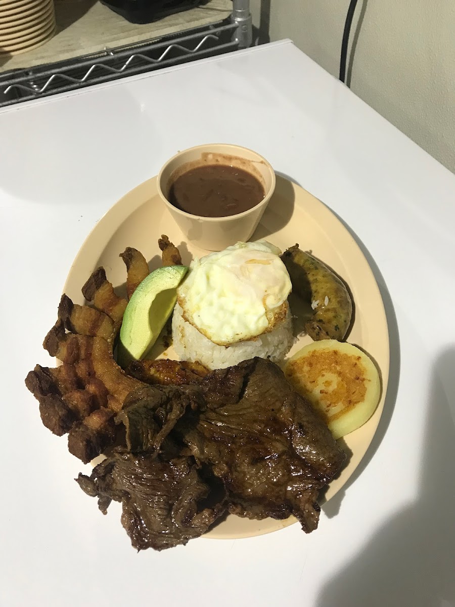 The menu offers a wide range of Colombian classics, from empanadas and arepas to larger lunch specials featuring grilled steak, rotisserie chicken, or a mix of meats. The Bandeja Paisa, a platter loaded with steak, chicharrones, sausage, and traditional sides like fried plantains and arepas, stands out as a satisfying option for those wanting to dive into the variety of flavors Colombia is known for. Portions tend to be generous, combining both familiar and more adventurous elements like crispy whole rotisserie chicken cooked over charcoal and the option of traditional soups such as mondongo. Prices are reasonable, making it a great spot for everyday lunches or casual dinners.